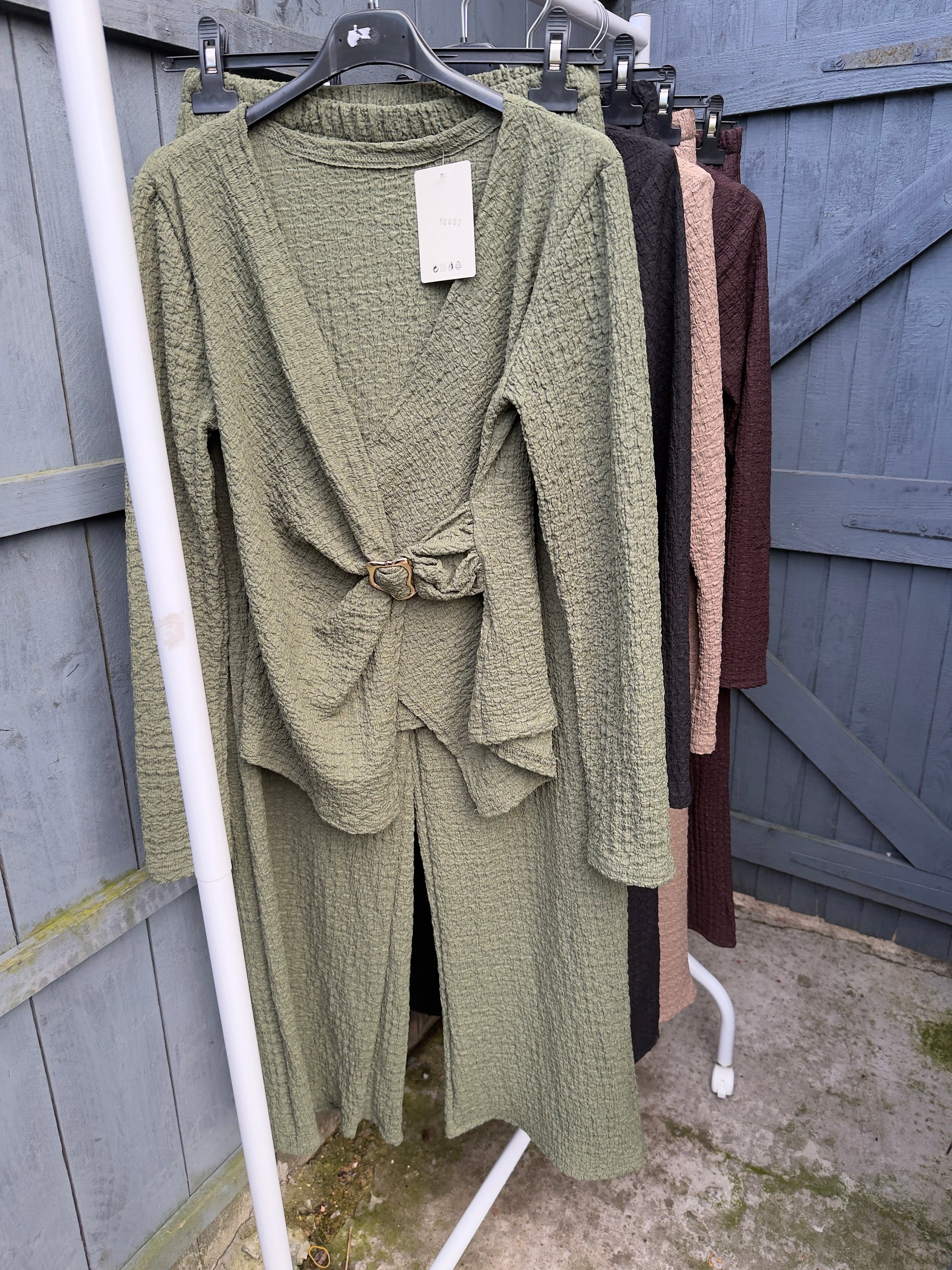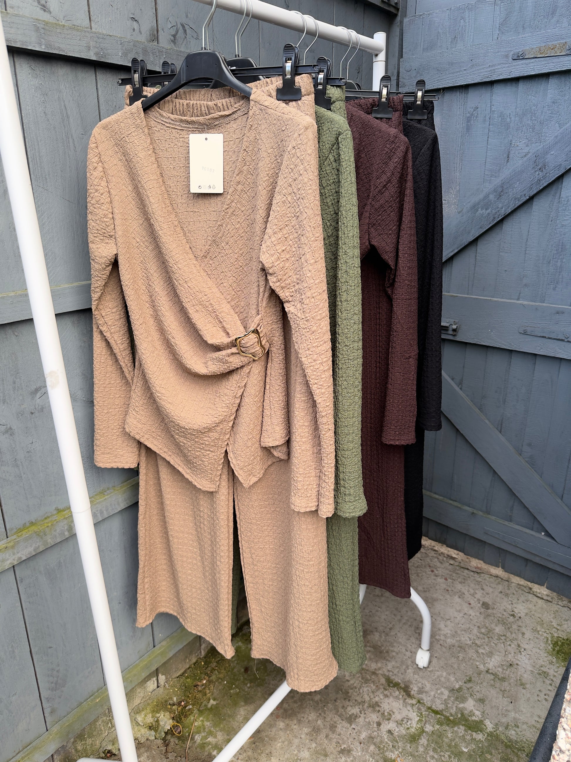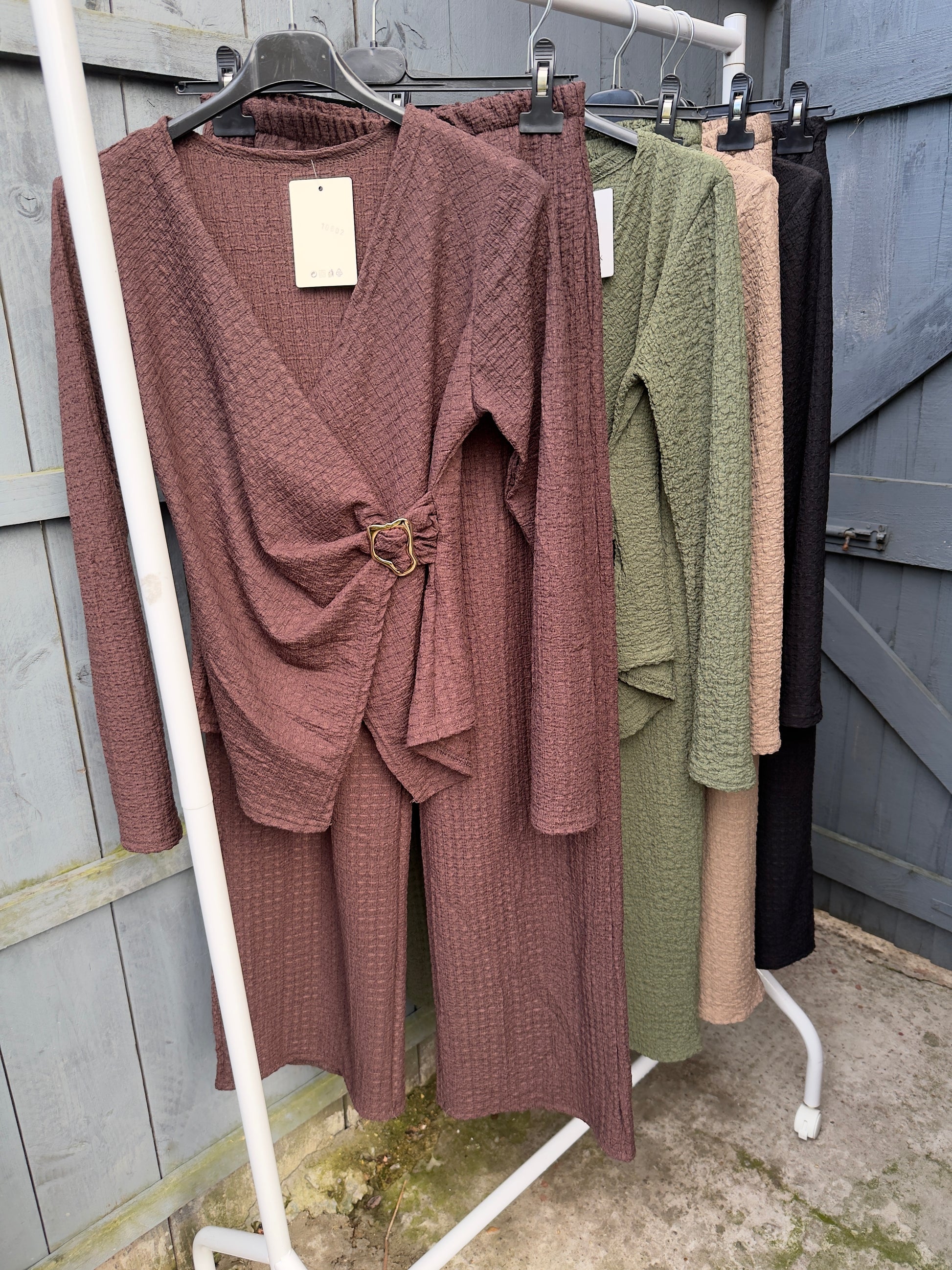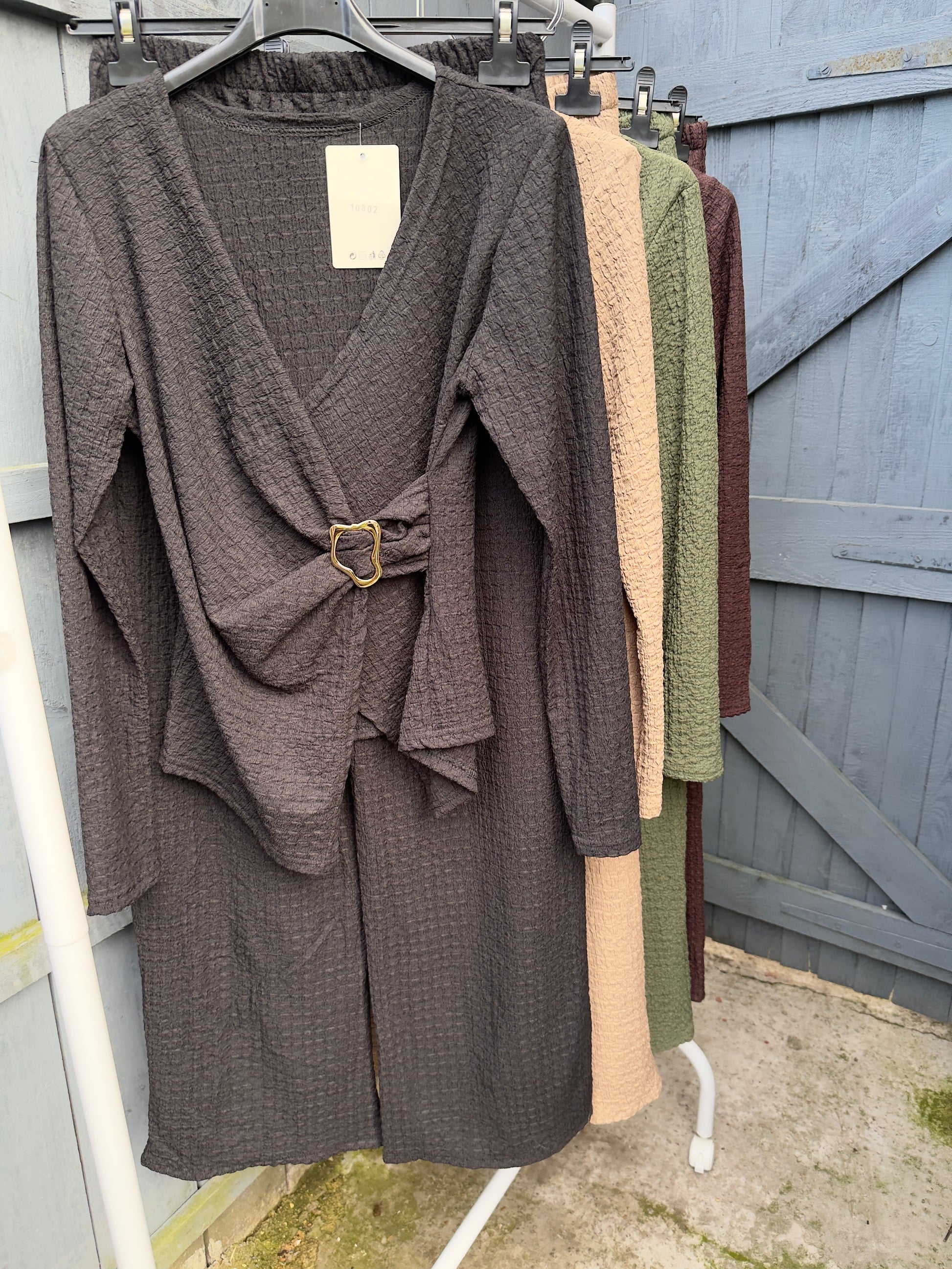 Upgrade your wardrobe this season with our Crinkle Gold Buckle Set. Designed to fit sizes 8-14 (with trousers that can accommodate up to a size UK 16), this versatile set effortlessly transitions from summer to fall. Its chic gold buckle detailing adds a touch of sophistication to any outfit. Elevate your style with this must-have set.